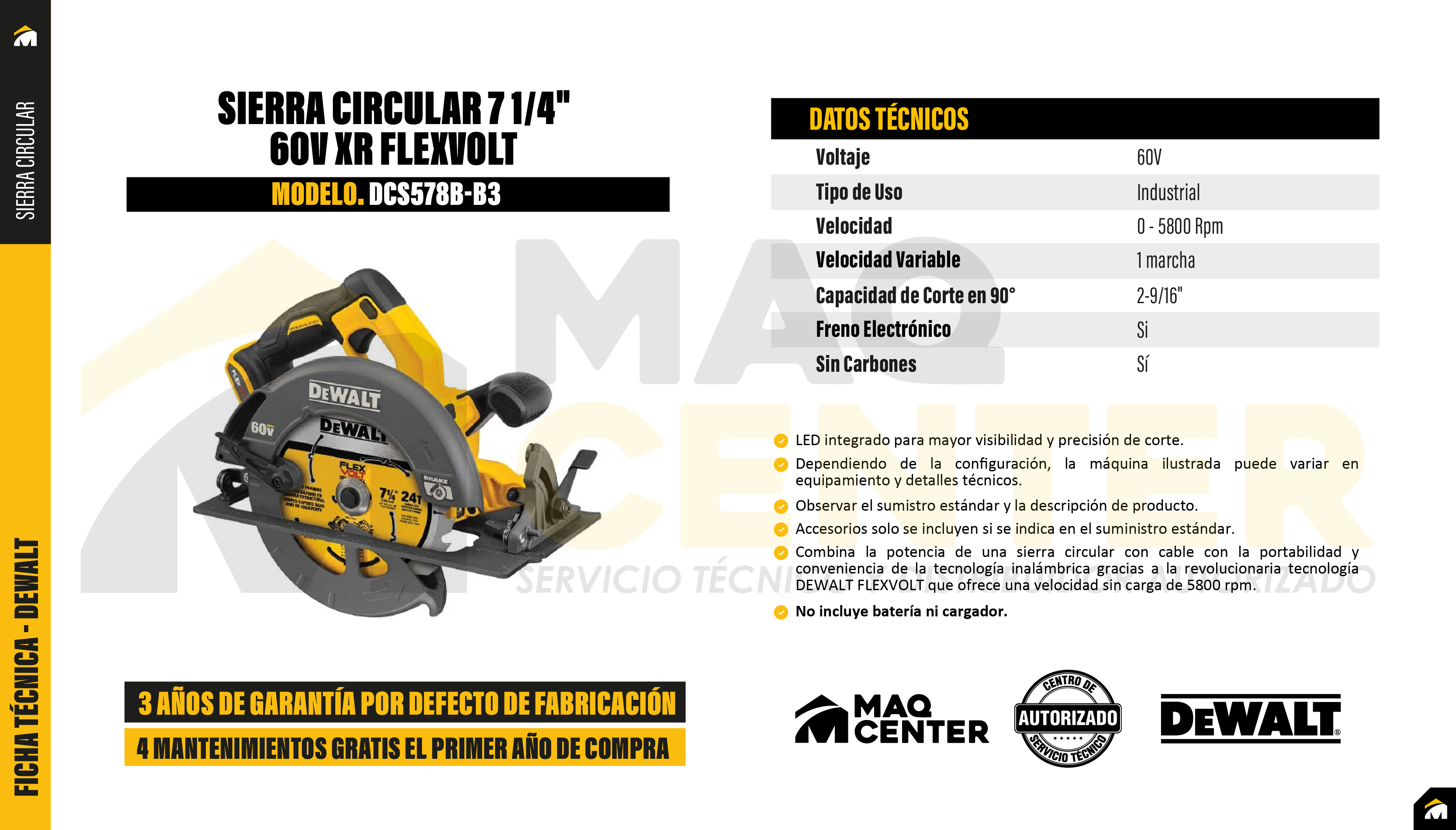 Hasta un 47% más de potencia que el DCS575. Utiliza una hoja de sierra circular de 7-1 / 4 pulg. Y presenta una profundidad máxima de corte de 2-9 / 16 pulg. A un bisel de 90°. Capacidad máxima de bisel de 57° con topes de bisel a 22,5° y 45° El freno eléctrico detiene la cuchilla después de que se suelta el gatillo Las baterías y cargador se venden por separado Dependiendo de la configuración, la máquina ilustrada puede variar en equipamiento y detalles técnicos. Observar el sumistro estándar y la descripción de producto. Accesorios solo se incluyen si se indica en el suministro estándar. LED integrado para mayor visibilidad y precisión de corte. Nuestras herramientas más poderosas acaban de mejorar con la sierra circular inalámbrica con freno eléctrico FLEXVOLT 60V MAX * 7-1 / 4 pulg. Tiene hasta un 47% más de potencia que la sierra circular DCS575 60V MAX * con 2456 vatios de salida.