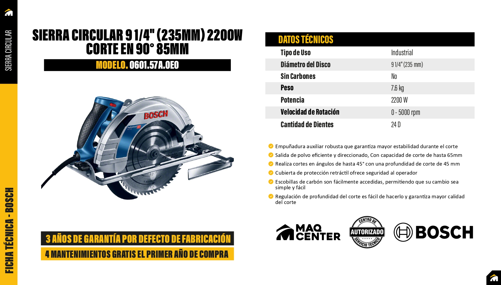 GKS 235 tiene dos miras para aumentar la precisión de corte, la base GKS 235 se puede inclinar hasta 48°, también tiene un sistema de eliminación de virutas optimizado. Tiene una potencia de 1700W, es la sierra circular con mejor rendimiento y con el motor más potente de la categoría. Tiene una excelente capacidad y versatilidad, ya que trae dos puntos de visión y sistema optimizado para eliminar virutas para mayor precisión en los cortes. Su base inclinada permite cortes en hasta 48° y la placa base en acero con doble fijación garantiza más estabilidad durante el corte. Regulación de profundidad del corte es fácil de hacerlo y garantiza mayor calidad del corte Cubierta de protección retráctil ofrece seguridad al operador