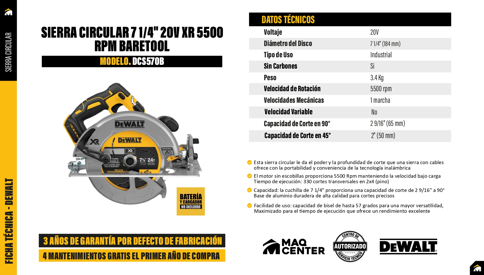Sierra circular inalámbrica 7-1/4'' 20v xr 5500 rpm dewalt dcs570b