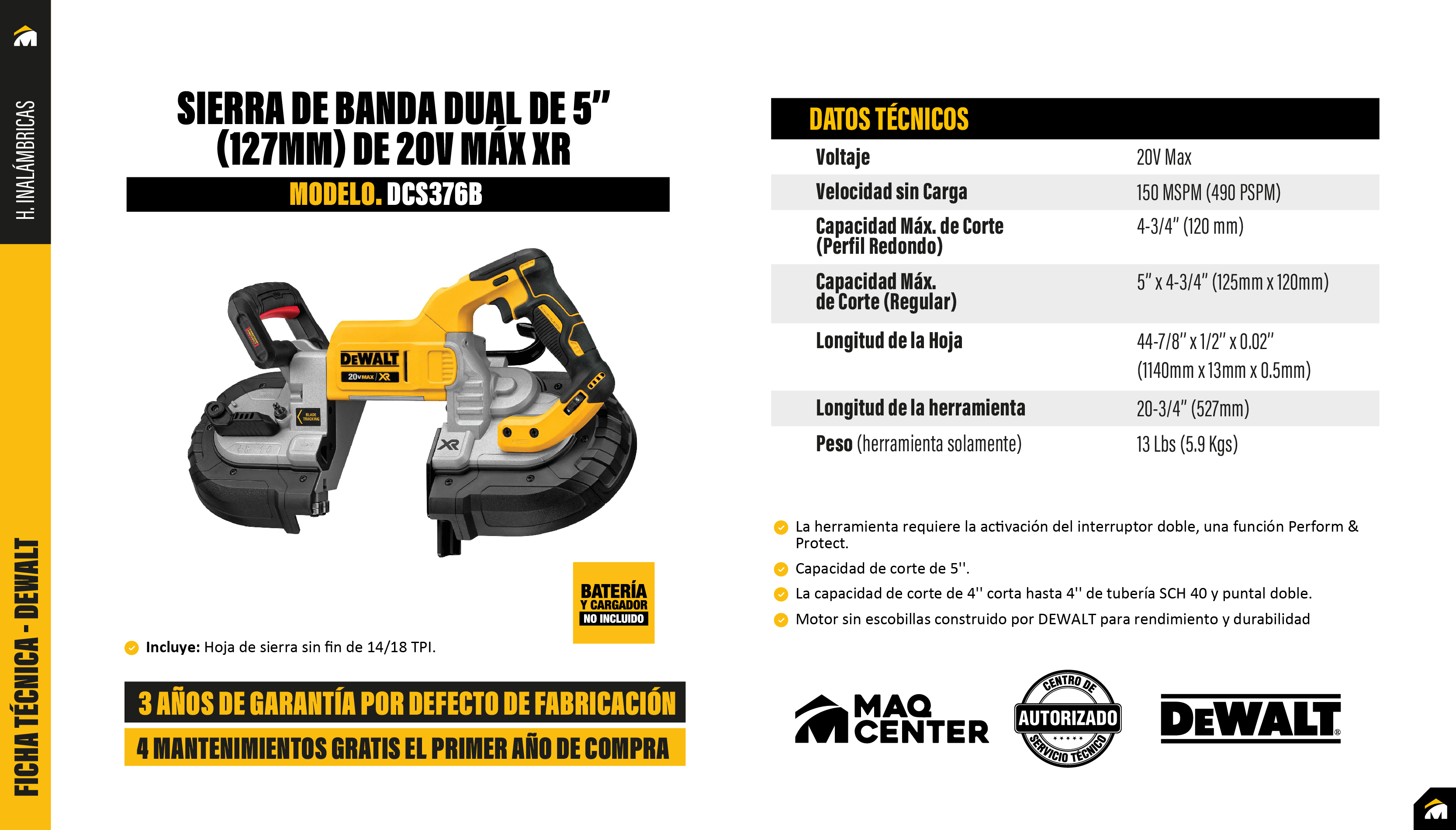 Sierra de banda dewalt 20v xr 5" (127mm) - dcs376b