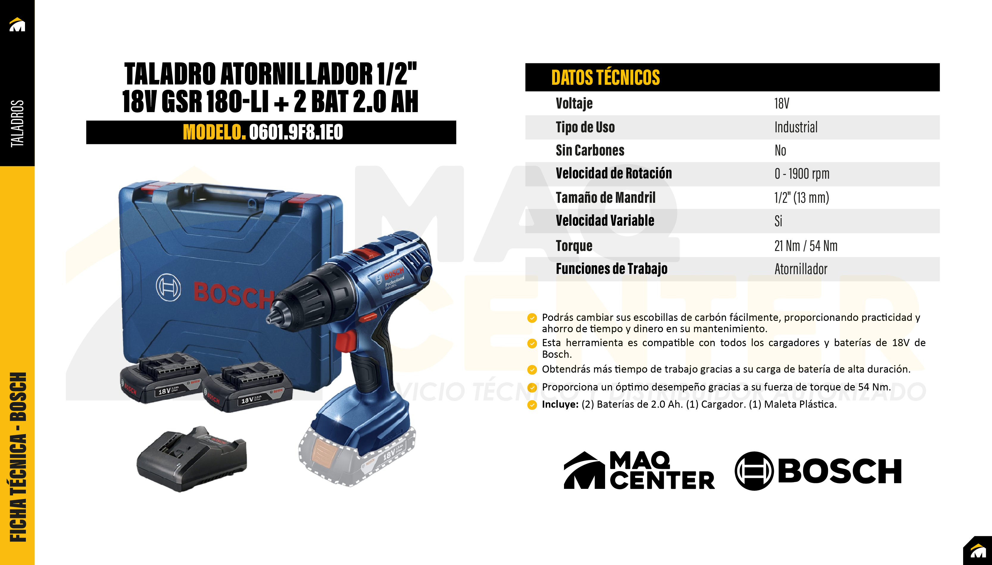 Taladro atornillador 1/2" 18v gsr 180-li + 2 bat 2.0 ah bosch 0601.9f8.1e0