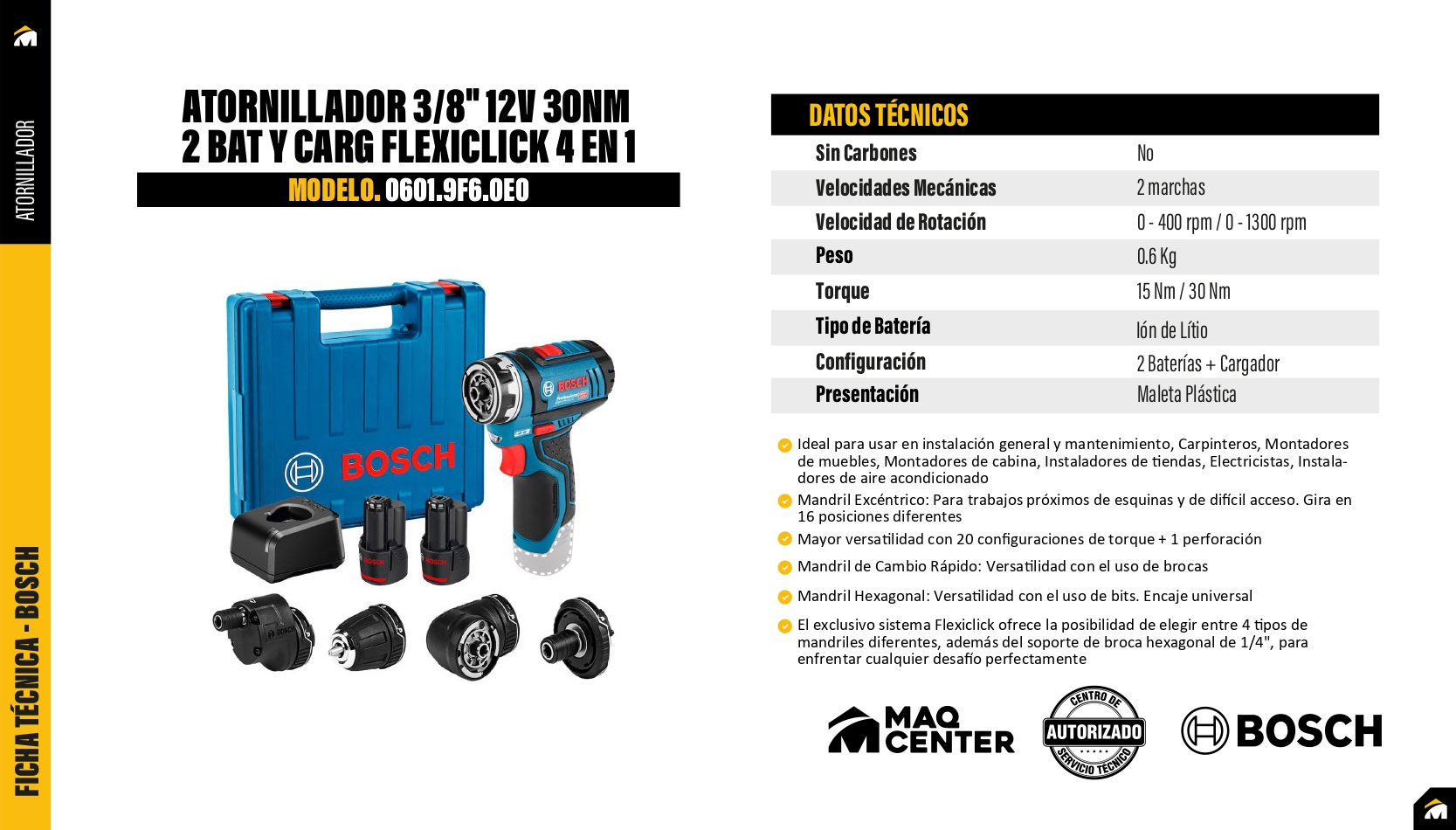 El exclusivo sistema Flexiclick ofrece la posibilidad de elegir entre 4 tipos de mandriles diferentes, además del soporte de broca hexagonal de 1/4", para enfrentar cualquier desafío perfectamente Mandril de Cambio Rápido: Versatilidad con el uso de brocas Mandril Hexagonal: Versatilidad con el uso de bits. Encaje universal Mandril Excéntrico: Para trabajos próximos de esquinas y de difícil acceso. Gira en 16 posiciones diferentes La gama más ligera y más larga de la categoría, con alto rendimiento en diversos taladros y atornillados Mayor versatilidad con 20 configuraciones de torque + 1 perforación Ideal para usar en instalación general y mantenimiento, Carpinteros, Montadores de muebles, Montadores de cabina, Instaladores de tiendas, Electricistas, Instaladores de aire acondicionado