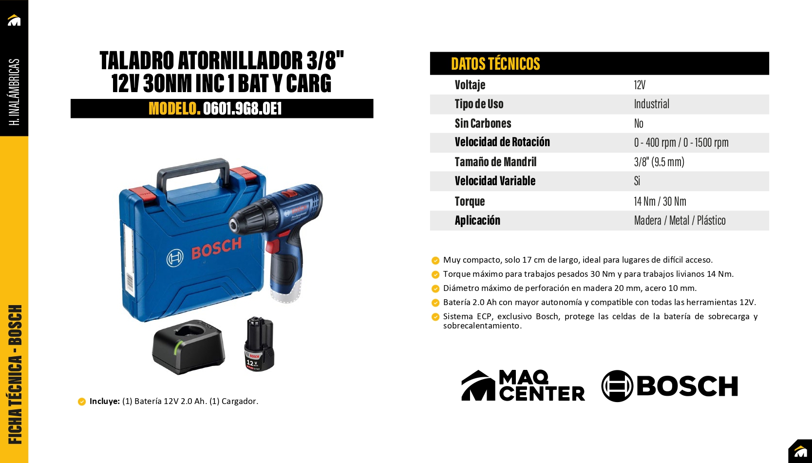 El Taladro Atornillador Bosch GSR 120-LI 12V es una herramienta compacta y potente diseñada para tareas de atornillado y perforación en madera, metal y plástico. Con un par máximo de 30 Nm y portabrocas de 3/8" (10 mm), ofrece el equilibrio ideal entre fuerza y control. Su diseño ergonómico y ligero permite trabajar con comodidad incluso en espacios reducidos o durante largas jornadas.