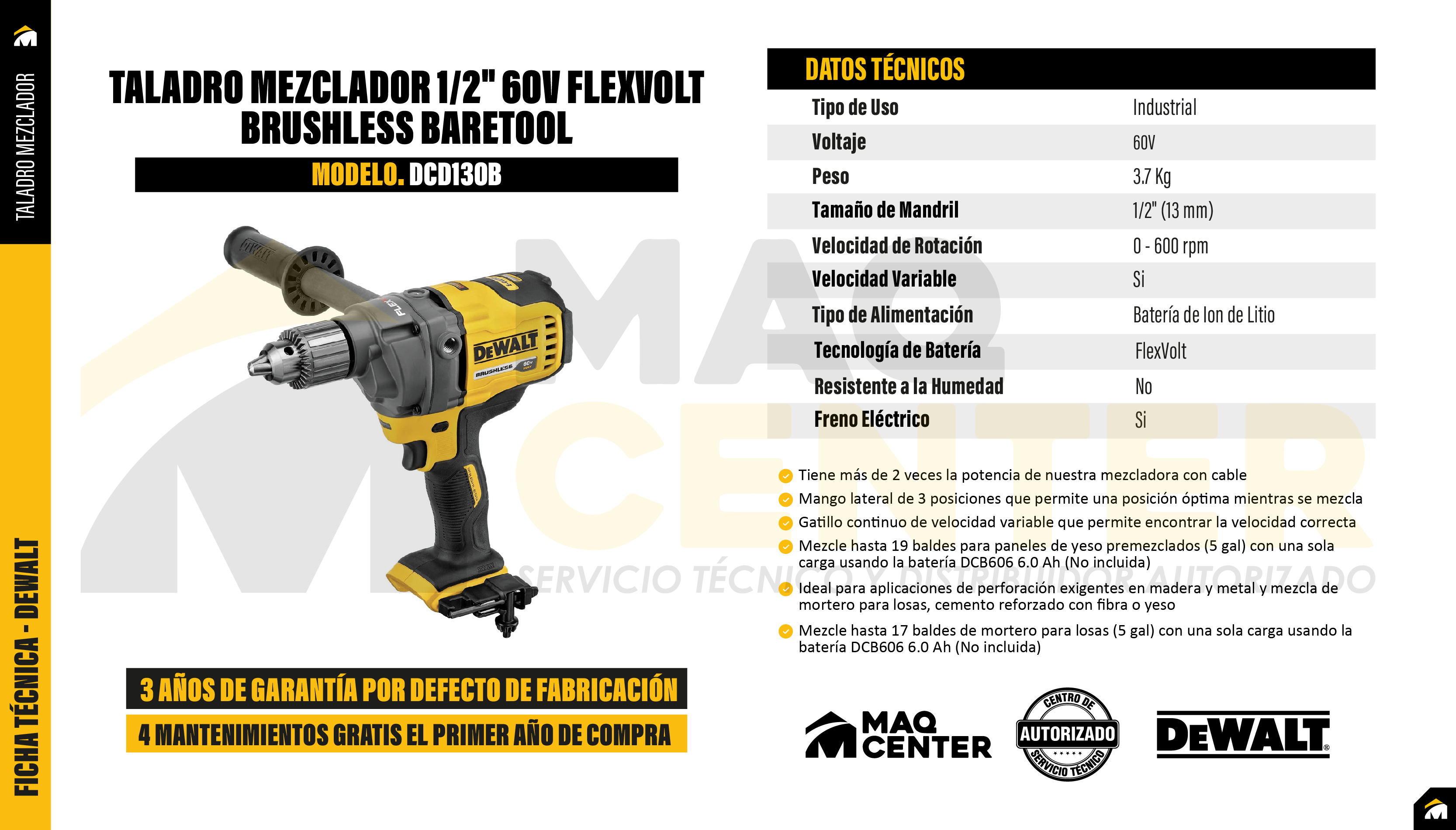 El taladro mezcladora DEWALT DCD130B de 60V FLEXVOLT está diseñado para tareas de mezcla intensiva en obras y talleres. Con mandril de 1/2" y un potente motor brushless, ofrece un torque elevado ideal para mezclar cemento, mortero, adhesivos, pinturas y otros materiales densos. Su tecnología FLEXVOLT permite un desempeño superior adaptándose a las exigencias del trabajo pesado, brindando mayor autonomía y potencia en cada uso.