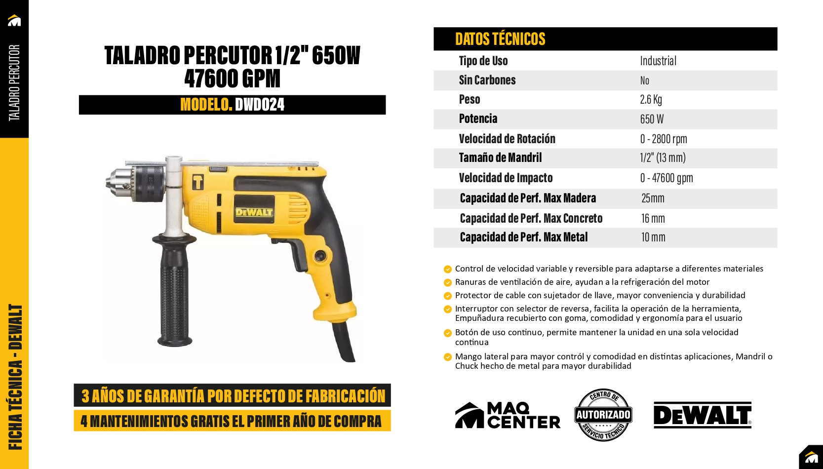 Mandril de 1/2" (13 mm), óptima capacidad de trabajo y mejor retención de brocas. Selector de modos, permite cambiar fácil y rápidamente de rotación a percusión. Surco para los dedos, mejora el control y el agarre del taladro. Ranuras de ventilación de aire, ayudan a la refrigeración del motor para una larga vida. Protector de cable con sujetador de llave, mayor conveniencia y durabilidad. Interruptor con selector de reversa, facilita la operación de la herramienta. Mango recubierto con goma, comodidad y ergonomía para el usuario. Botón de uso contínuo, permite mantener la unidad en una sola velocidad contínua. Mango lateral para mayor control y comodidad en distintas aplicaciones.