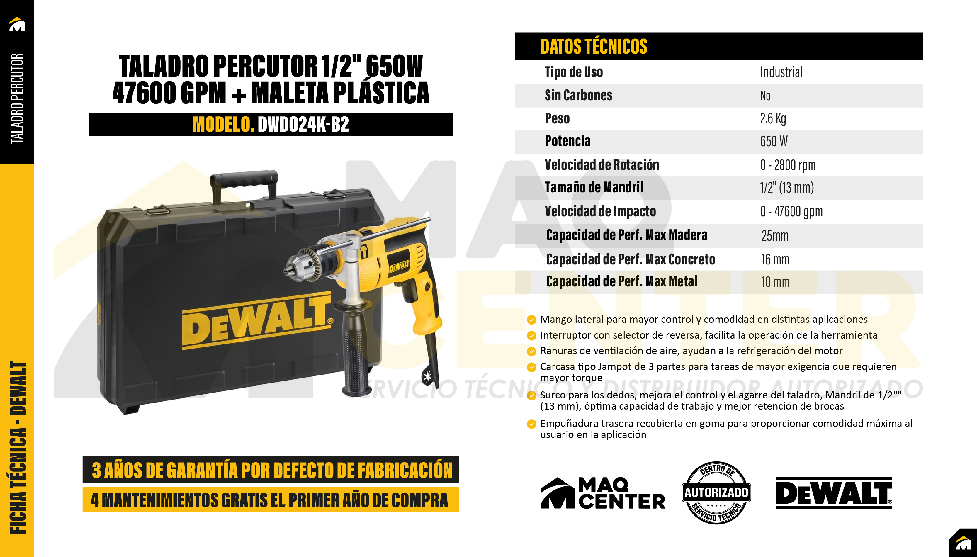 Incluye: (1) Llave del mandril. (1) Mango lateral. (1) Varilla de profundidad. (1) Maleta Plástica.