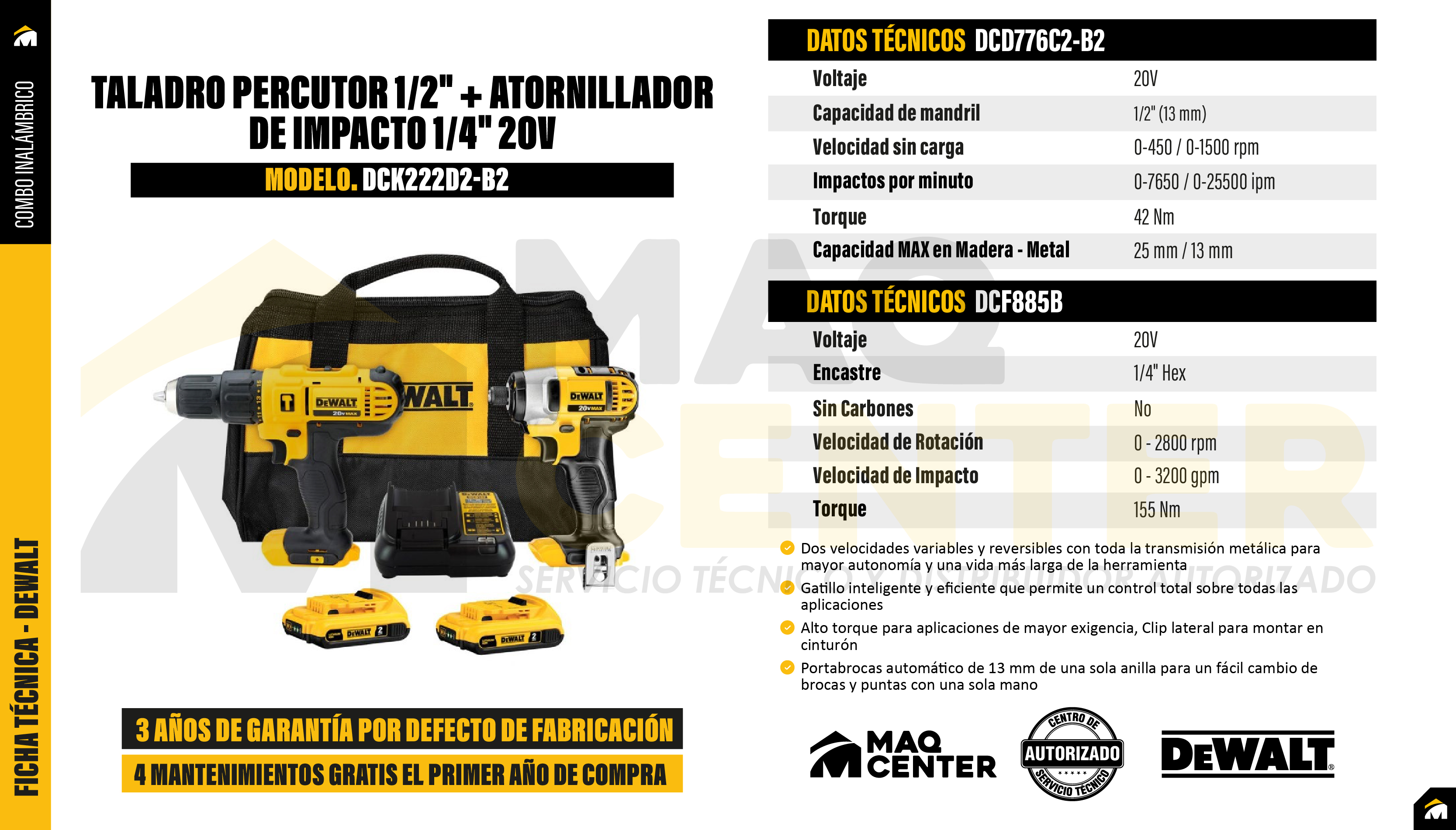 Taladro percutor 1/2'' + atornillador impacto 1/4'' 20v dewalt dck222d2