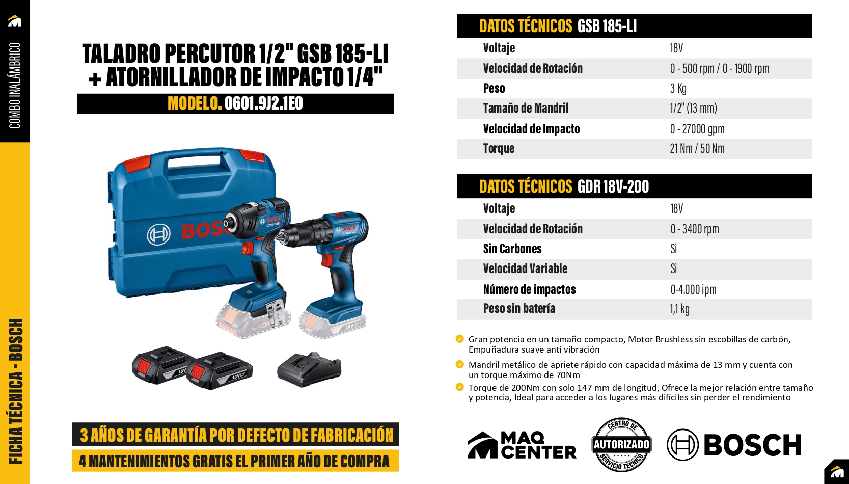Taladro Percutor 1/2" 18V Brushless Bosch GSB 185-LI: Mandril metálico traba mejor el accesorio y ofrece mayor robustez y durabilidad Luz led en la base de la herramienta Motor Brushless sin carbones que ofrece mayor potencia y menos mantenimiento Manejo y funcionamiento sencillos Gracias al motor sin carbones se ofrecen más horas de trabajo por carga y una mayor vida útil de la herramienta Electronic Cell Protection una forma de ""chip"" que protege las celdas contra descarga profunda, sobrecarga y uso en temperaturas anormales Atornilla en madera hasta 10 mm y taladra en madera hasta 35 mm, así como en metal o mampostería hasta 10 m