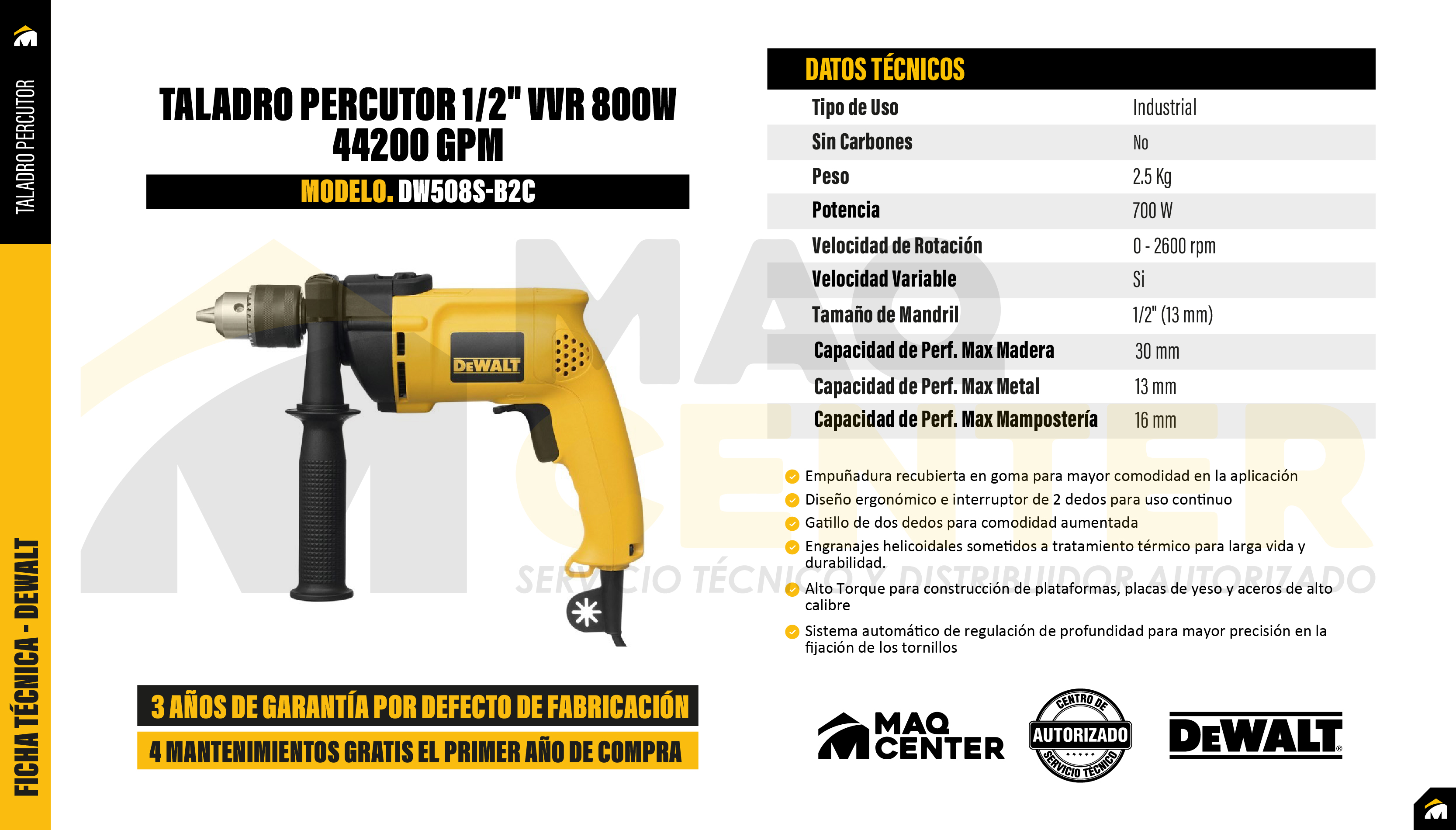 Sistema de percusión mecánico para perforar mampostería, ladrillo y bloques. Perforaciones en madera y metal en diámetros inferiores a 1/2". Herramienta ergonómica, cuenta con rejillas de ventilación para mejor enfriamiento de la misma. Gatillo de encendido. Cuenta con botón con bloqueo para uso continuo. Selector de sentido de giro. Cuenta con selector para poder usar sistema de rotación (perforación en madera y metal) y percutor (perforación en cemento). Mandril o Chuck hecho de metal para mayor durabilidad. Mango lateral multiposición.