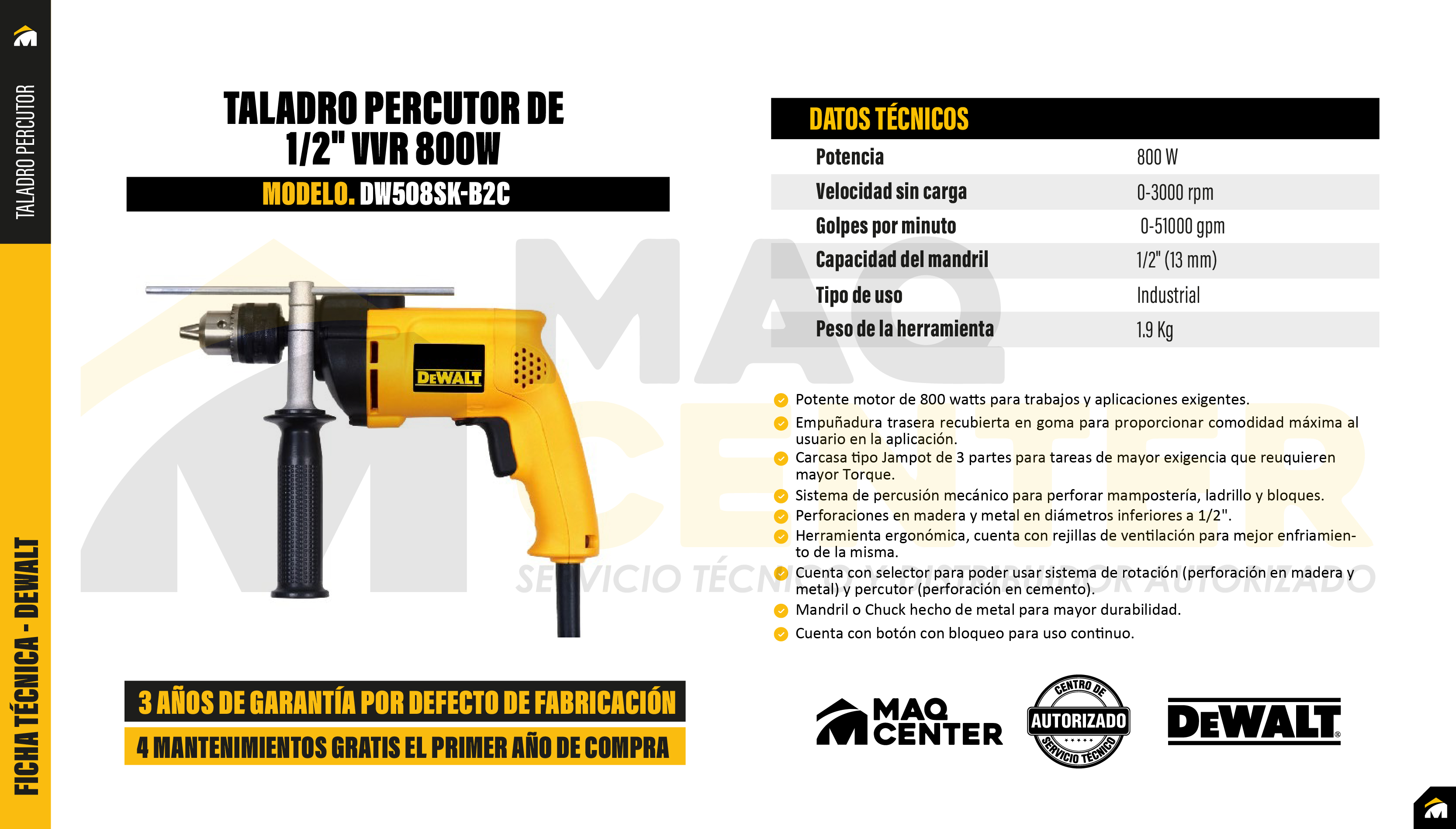 Taladro percutor de 1/2" vvr 800w dewalt dw508sk-b2c
